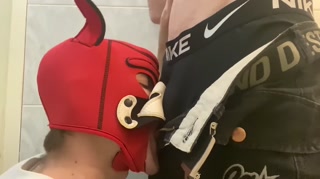 Top fucks his bottom's puppy in the mouth, makes him choke on his cock and cums. Gagging big dick