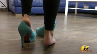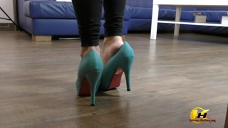 In blue high heels shoe play and next feet job with red dildo