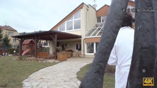 OLD4K. Old guy bangs the girls trimmed snatch on his white couch