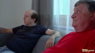 Teen brunette showing 2 grandpas a good time with a hot footjob and cumshot on her pussy