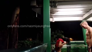 asian girl and her roommate fucking outdoor in Public during a walk, He creampied her.