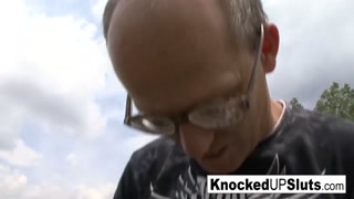 Knocked up slut takes care of a cock outdoors
