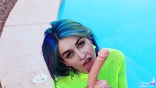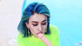 Blue-haired Babe Riding and Suck Dildo - Facial Imitation near the Pool