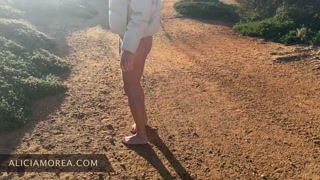 Blonde girl walks pantyless and barefoot and pisses on the path