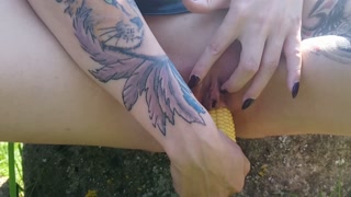 Shameless Lucy Ravenblood fucking pussy with corn in public