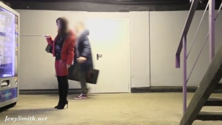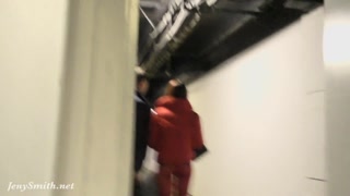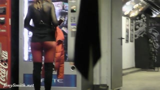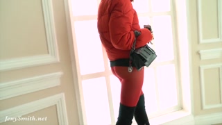 Red Tights. Jeny Smith public walking in tight red pantyhose (no panties)