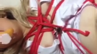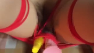 【再編集】赤縄固定でおもちゃ挿入。バイブ2本と口にもおもちゃ加えさせて鑑賞