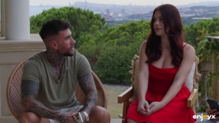 Busty Redhead Babe in Sexy Lingerie and Stockings Sucks Two Guys After a Short Conversation..