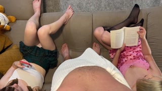 Two Hot College Erasmus Girls in Short Miniskirt and Satin Night Dress No Panties plays with a Cock
