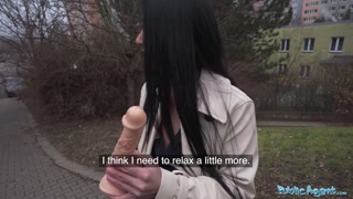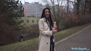 Public Agent She tries to get a dildo down her throat and then fucks a huge cock
