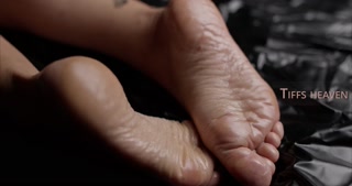 Tiffany rubs oiles wrinkles soles and receive cumshot on feet