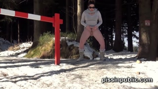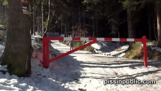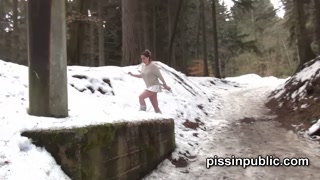 Girls in need skate around in the snow to find a proper place to have a pee