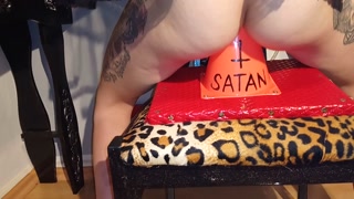 Gothic slave girl fucks her ass fo satan with crucifix and traffic cone