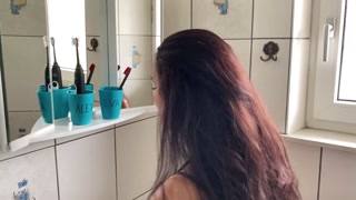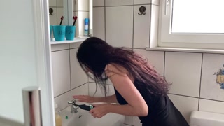 naughty girl masturbates in the bathroom with her boyfriend's toothbrush