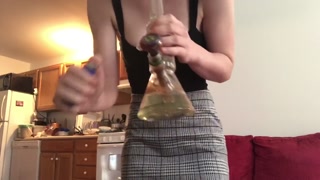 Very school girl in plaid skirt smokes and strips