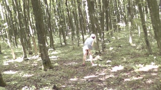 Upskirt no panties . Naked mommy Milf without panties picks mushrooms in forest . Outdoors Outside