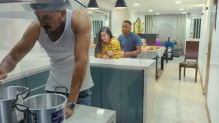 My husband's best friend Rioc visits us and secretly fucks me in the kitchen