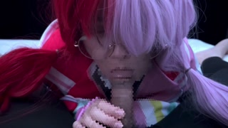 One piece Diva Uta in glasses takes him to a virtual space to gokkun blow his dick.