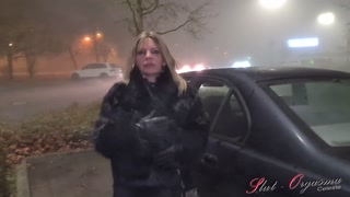 Slut-Orgasma Celeste equine dildo deep throat on a public parking lot before shopping