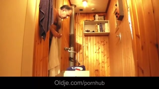 European hottie fucking old guy in the sauna cumshot swallow