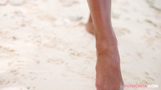 Putri Cinta on a stunning beach pulling her lips apart