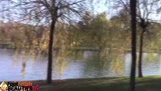 Barefoot brunette takes off nylons, shows feet in a park