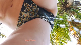 Wetting bikini with my urine under palm trees during vacation
