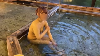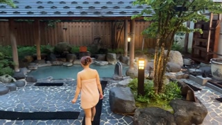 A Japanese couple enjoys a hot spring, then they do stocking costume and have sex