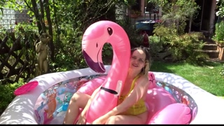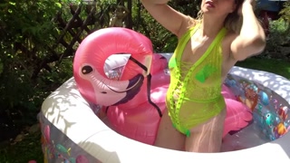 Lingerie Wet Haul and ride an inflatable Flamingo