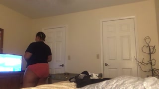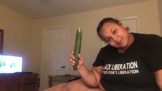 Play with my cucumber until he comes out of the bathroom and fucks me