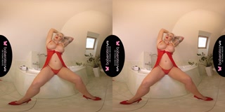 Solo blonde big tits Jarushka Ross hevy masturbating with glass in VR.