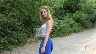 Kleine geile blonde Schülerin läuft auf der Straße und lässt sich unter den Rock gucken