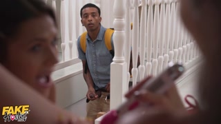 Fake Hostel A guy with a big black cock walks in on two sexy lesbians and fucks them both