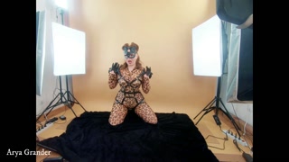 Backstage from fetish photosession, spandex leopard print catsuit and leather thigh high boots