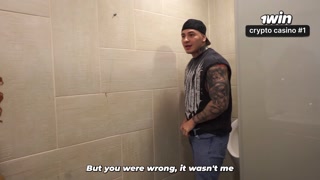 Distracted busty redhead ends up in the men's bathroom and can't resist seeing a big dick
