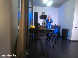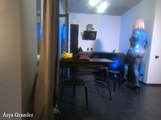 Latex rubber fetish curvy milf woman in blue texturized catsuit. Backstage from the photoshoot.