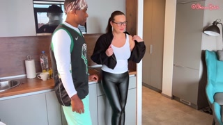 WOW! I finally got to taste a BBC! Chic in leather pants gets fucked by two foreign students!