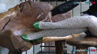 Blonde teen foot teasing in white and black stockings