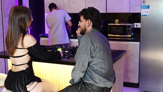 My girlfriend fucks her schoolmate while I cook for her.