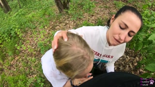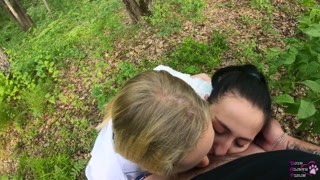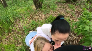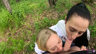Two Girlfriends Suck Cock in the Woods - Threesome Outdoor Blowjob - Public POV