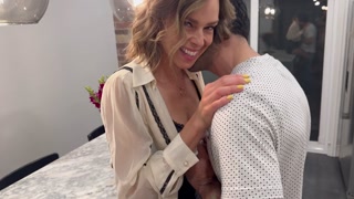 Wife gets pantyhose / tights ripped then fucked and double creampie in kitchen by husband and friend