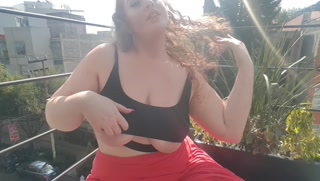 busty bbw exhibitionist squirts hard on public balcony