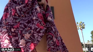 Mia Li shows off her bushy pussy in some outdoor upskirt fun