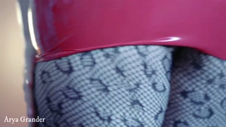 Nude Topless Curvy Girl In Red Fetish PVC Corset and Latex Skirt Wearing Rubber Gloves
