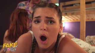 Fake Hostel Big busty pale backpacker squirted on by hot fit Latina friend before threesome fun