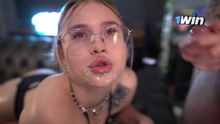 I'm wearing glasses so you can cum on my face! Sucking his cock for a very long time before fucking