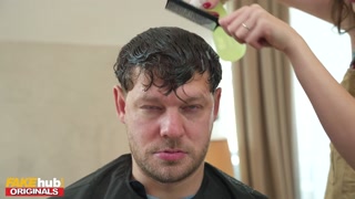 FAKEhub - Natural boob brunette trainee working in hairdressers tries cutting clients hair herself