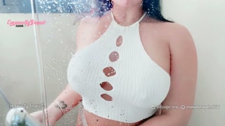 Sexy latina teasing in the shower big ass and big boobs against the glass wet t-shirt