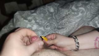 He loves it when i make his little dick cum with my orange long nails *cum runs on my long nails*
